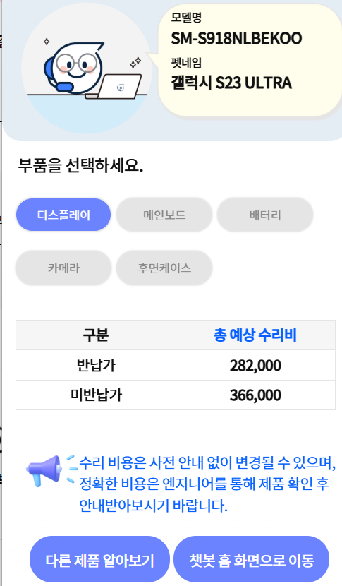 - 디스플레이(액정), 메인보드, 배터리, 카메라, 후면케이스 등 교체를 원하는 부품을 선택하면 예상 수리비용이 표시됩니다.