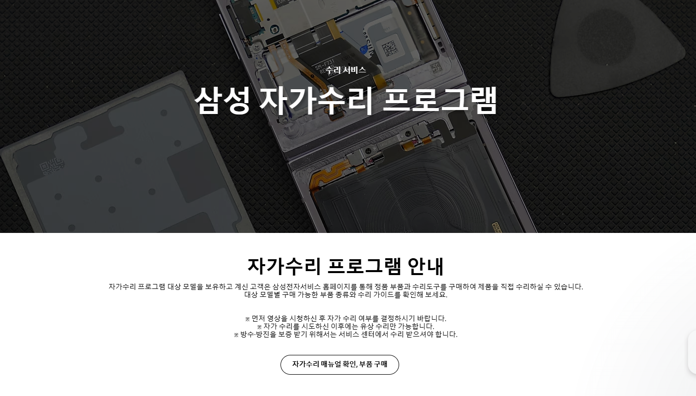 - 삼성 자가수리 프로그램 페이지에서 대상 모델, 구매 가능한 부품, 수리 가이드 등을 확인하실 수 있습니다.